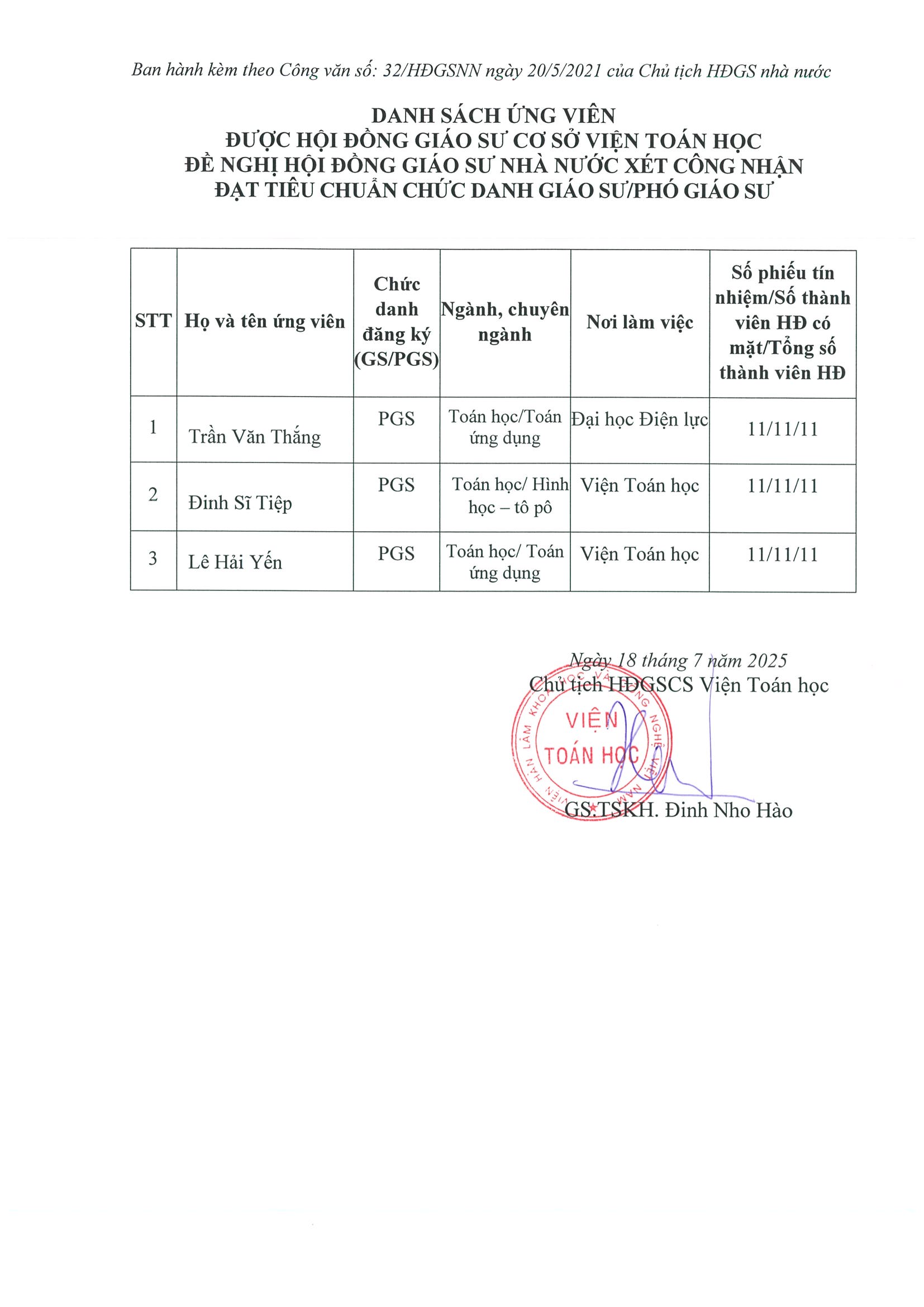 Công khai kết quả xét công nhận đạt tiêu chuẩn chức danh GS/PGS năm 2025 tại Hội đồng chức danh giáo sư cơ sở Viện Toán học